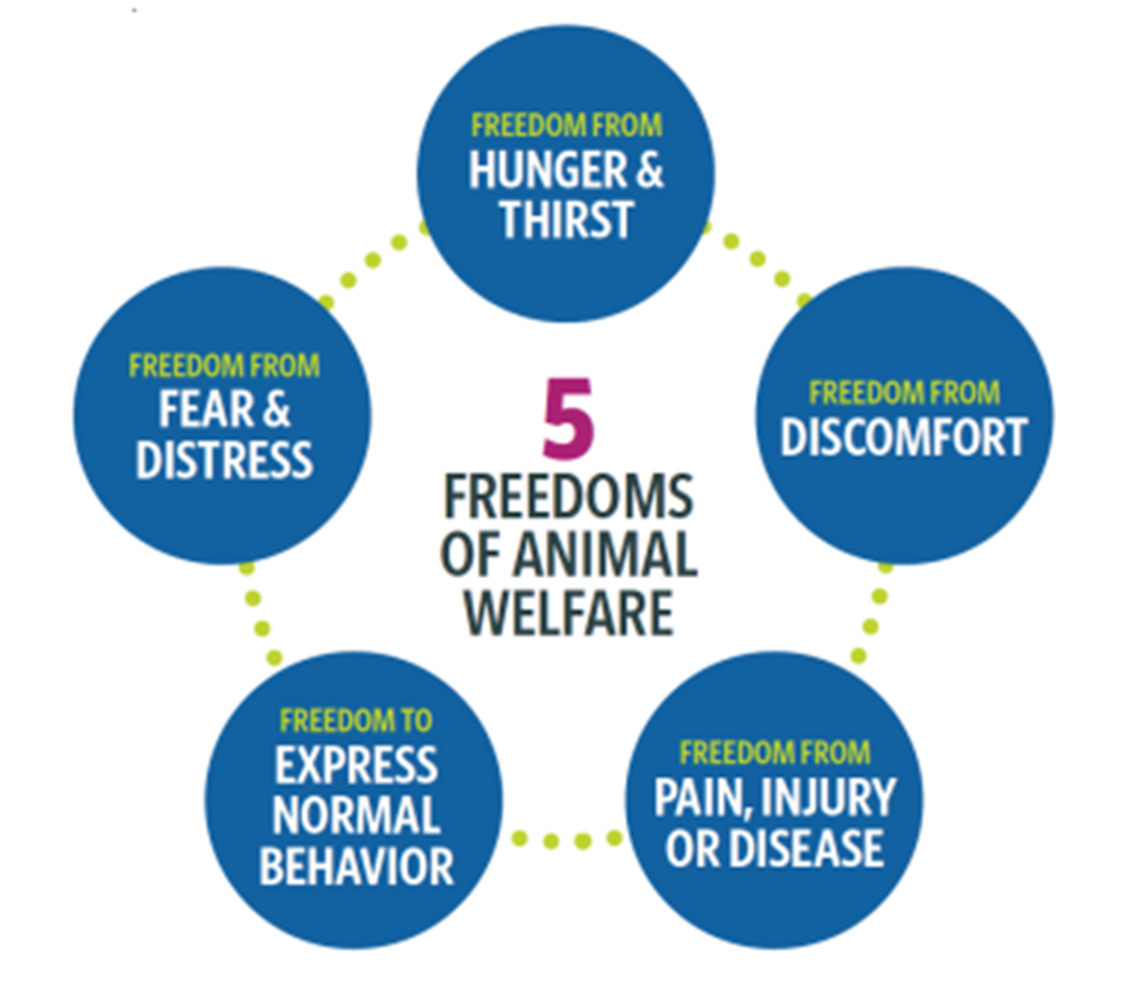 Het “vijf vrijheden model” uit 1965 is de basis van het “vijf domeinen model” uit 1995: voeding, leefomgeving, gezondheid en gedrag hebben allen een effect op het mentale welzijn van het dier.